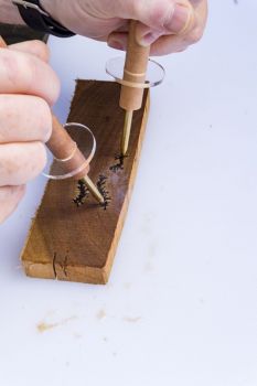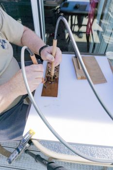 With your workplace setup, using the instruction sheet guidelines for safety, you can locate your burner, place the foot switch in a convenient location, and plug it in. Having properly wetted your wood object, you place the probes as desired holding them securely, one in each hand. Once ready, you press the spring-loaded foot switch to the depressed and on position. You'll know it is on because the only light, a big red one, located on the face of the box, will turn on. Depending on all of your variables, you may have to wait a bit for the burn to begin. If something is awry, too much or too little dielectric, too much distance between the probes, or a troublesome species of wood, simply release the foot switch turning the unit off and place the probes in the holes in the face of the unit. The unit couldn't be simpler. Get things ready, plug it into the wall, and step on the foot switch for on and release the foot switch for off.