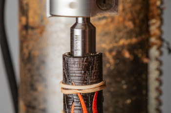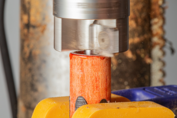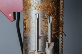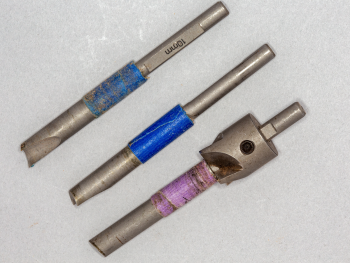 ![]() Photo 21 - Virtually all of the sizes are longer than the tube once it is up to the cutting area. This requires an open hole below the blank to allow the excess pilot length a place to go. |