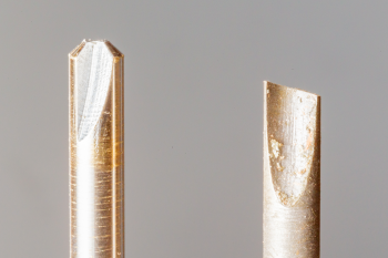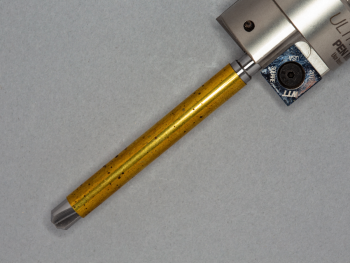 ![]() Photo 18 - An occasional problem with traditional pen mills. The brass tube can creep between the pilot and the cutter leaving a ragged un-flat tube end. |