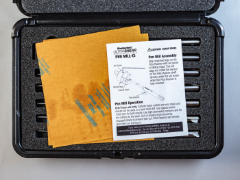 My other issue with the pen mill in use was the operation of their reamer. While it allows for a positioning operation with the drill press running, I don't need that and wasn't a fan of how well the reamer worked on polyurethane adhesives. It seemed to work fine with adhesives that were only cladding the ID walls, but not when the whole ID was plugged. There was no way to "drill" through this situation since the design has no way to expel debris upwards. All debris needs to exit downwards. As a user of mostly polyurethane adhesives other than laser cut kits, the reamer operation didn't work as well as the side scoop removal tools. They can exit debris upwards as you engage them.