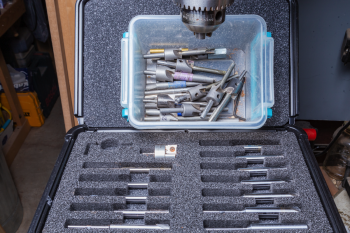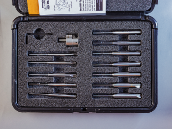 Inside the case were the instruction sheet, a couple of sheets of anti-rust Protek Wrap, the cutter head, the two Allen wrenches needed, and the entire set of 12 pilot/reamers all nestled into their respective foam cutout pockets. The foam padding keeps everything orderly and protected. This not only protects the cutter faces on the cutter head but also the sharp surfaces on the pilot/reamers. Since only one pilot is used at a time, it is very convenient to replace the current pilot into the correct storage pocket prior to taking out another. None of the pockets are marked with a size but this arrangement of replacing the recently used pilot and then taking a different one keeps everything in workable order.