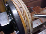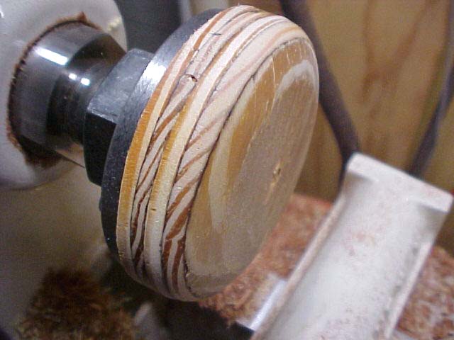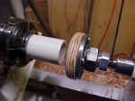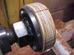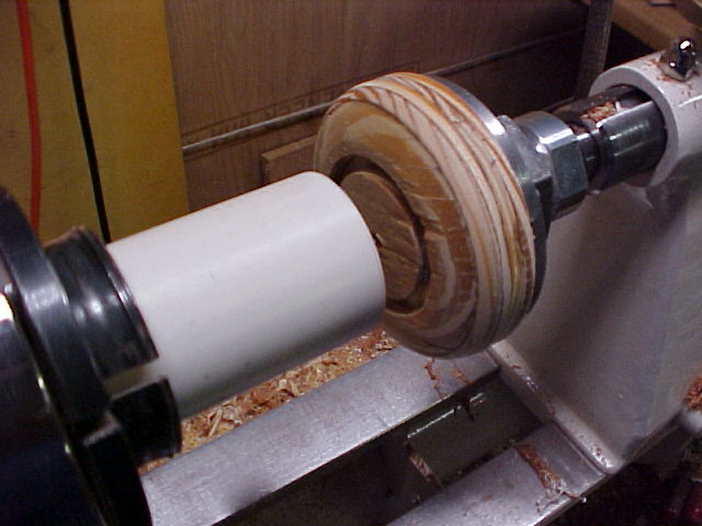 The faceplate ready for gluing is threaded on the tailstock fitting. |