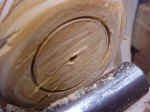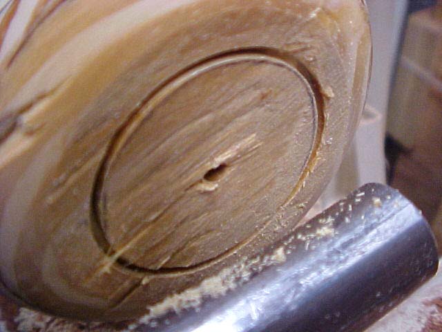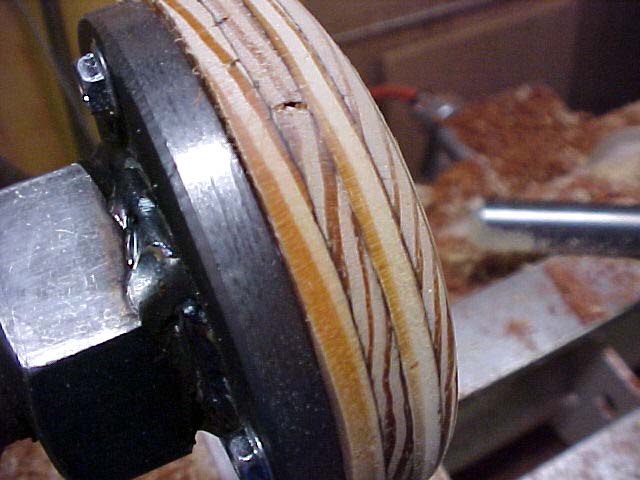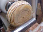 With no reason to be at exactly the same diameter as the steel on the faceplate, the wood is only turned until round and close in diameter. |