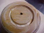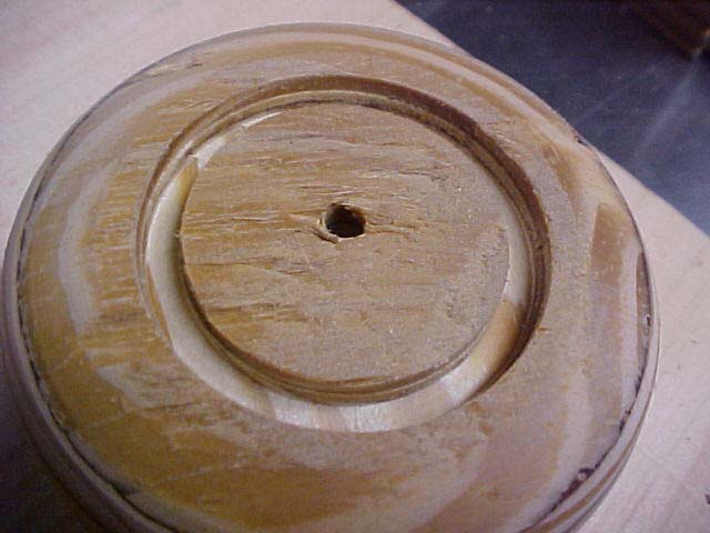 A hole is drilled in the center to couple the vacuum through as well as three holes drilled for fastening the faceplate to a wooden block.