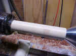 The cut end is then true with a skew, the sharp edges are radiused with sandpaper, and the id, od, and end are sanded to roughen them for gluing. |