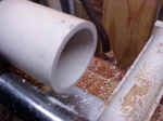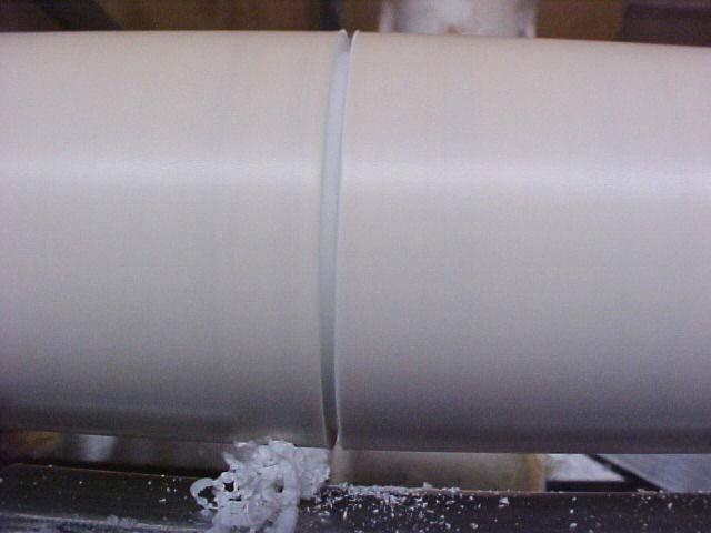Once the PVC pipe is running true in the chuck, a parting tool is used to cut a length the proper distance from the chuck. |